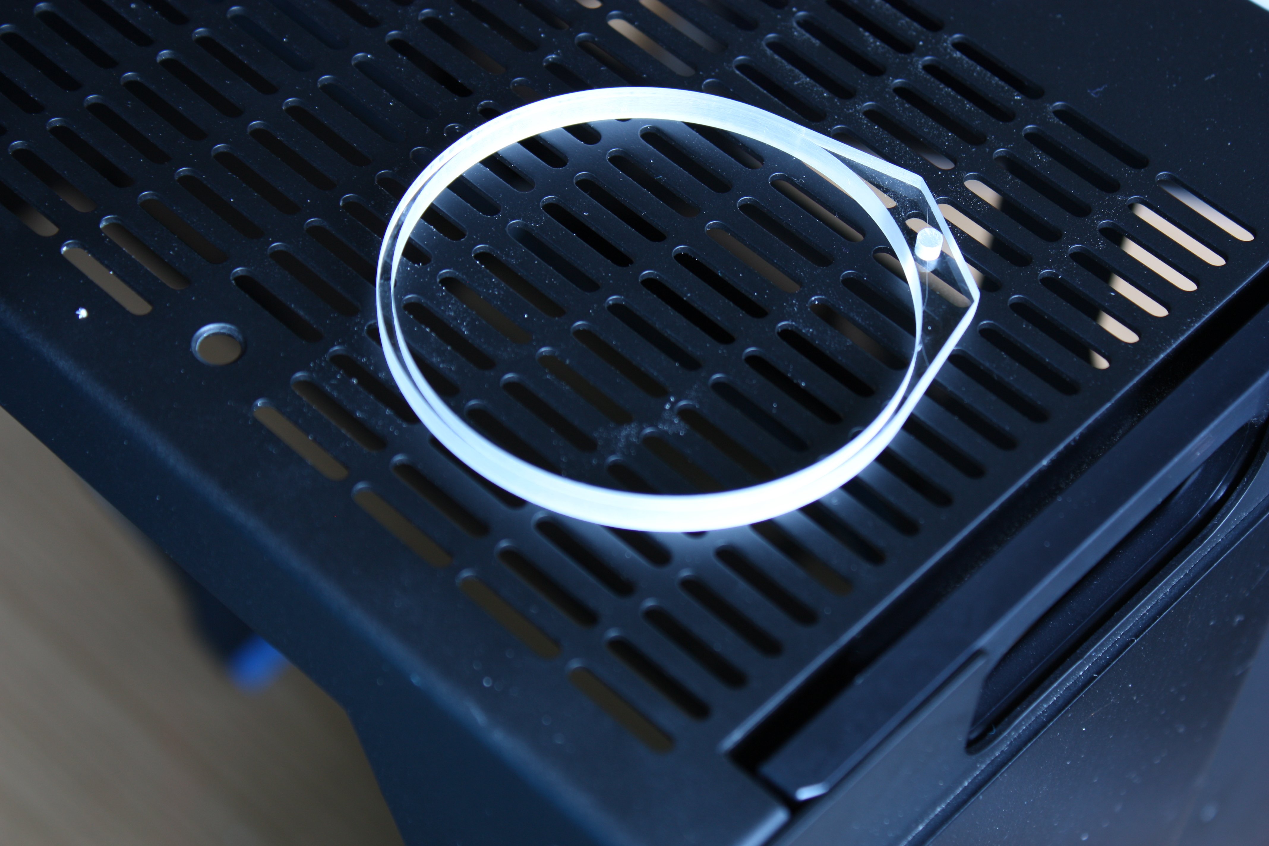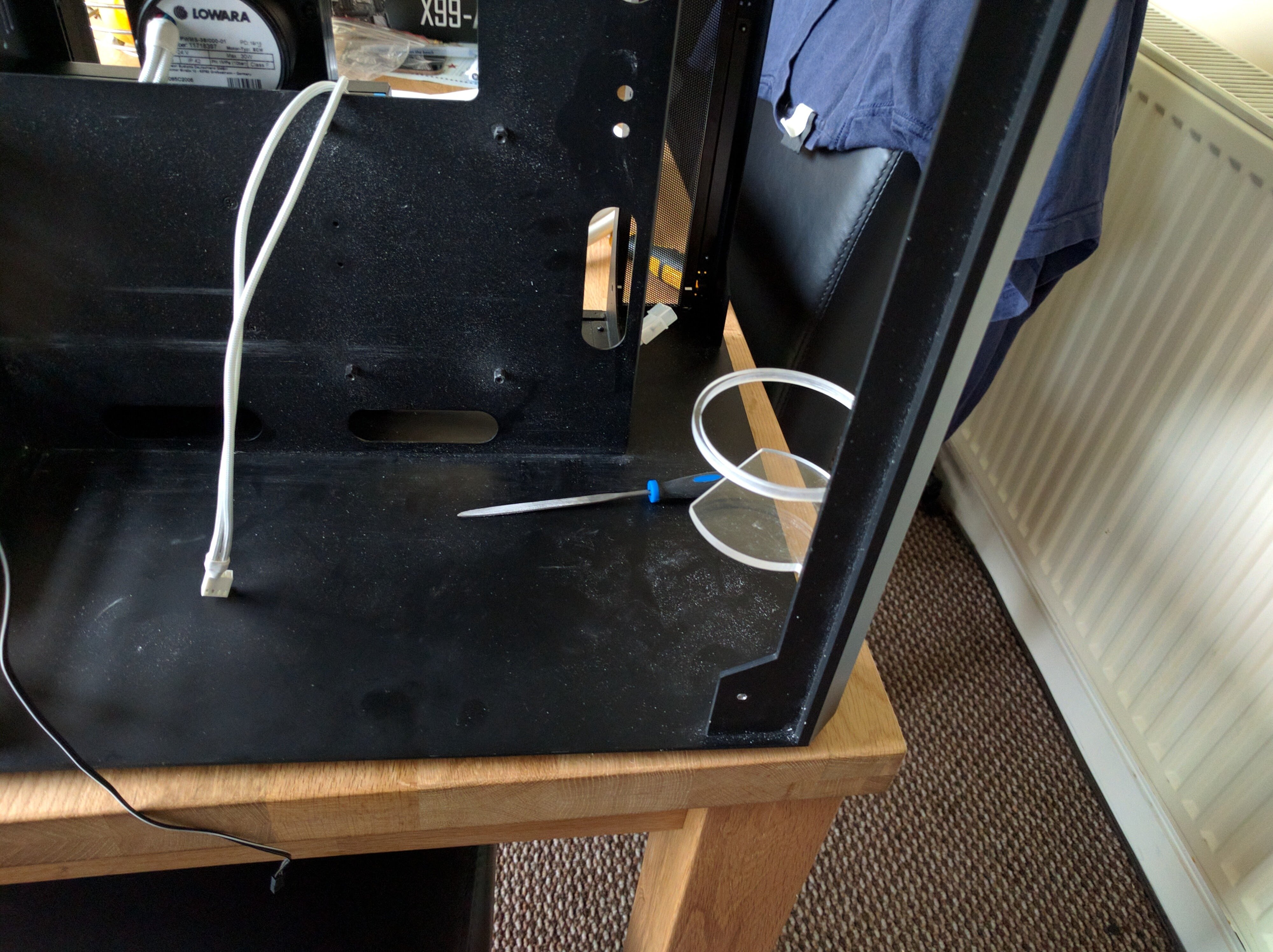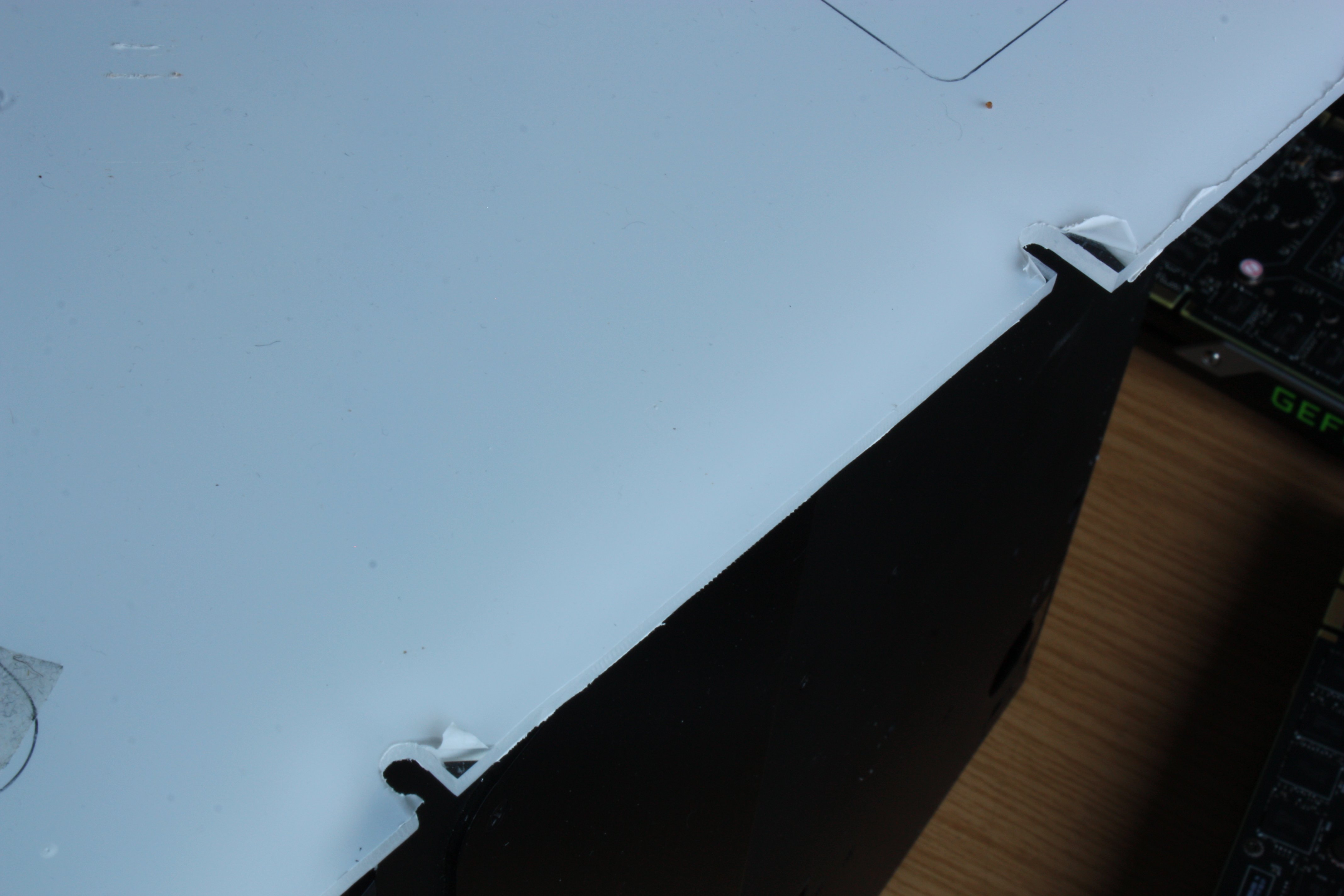 The first stage of this build was to hand cut a piece of acrylic that would fit perfectly into the front compartment of the PC where the motherboard is mounted. This was relatively easy although several custom notches where needed to fit perfectly around the edges of the case where the metal panels where riveted etc.