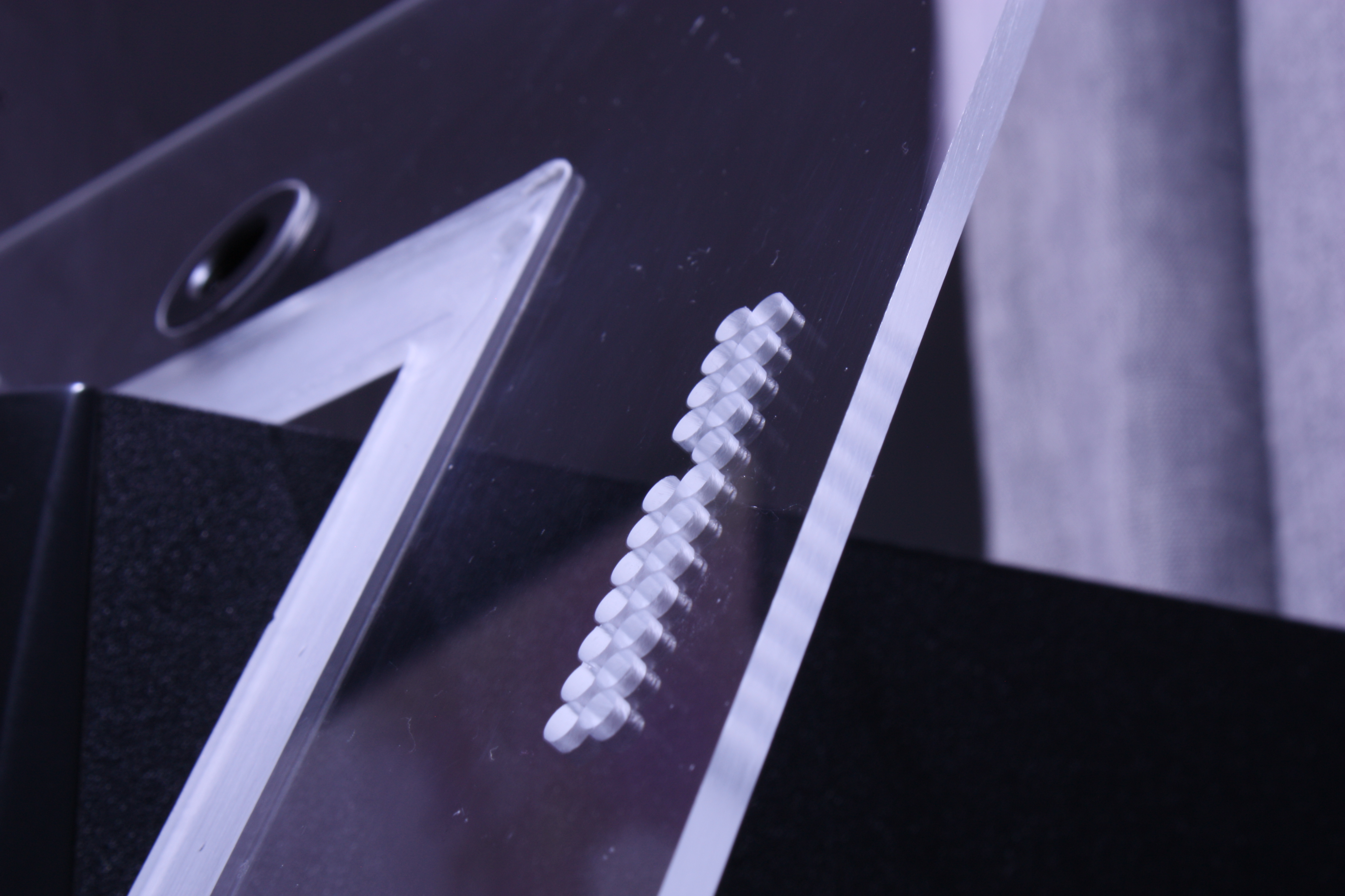 The reason for first painting it white and then matte black was due to the fact I left the leading edge transparent allowing for addressable LEDs to be mounted along the edge. The first white coat would aid in maintaining brightness for the side firing LEDs in order to create a custom loading or progress bar along the edge. Below you can see the transparent edge that was left and a test of the LEDs.