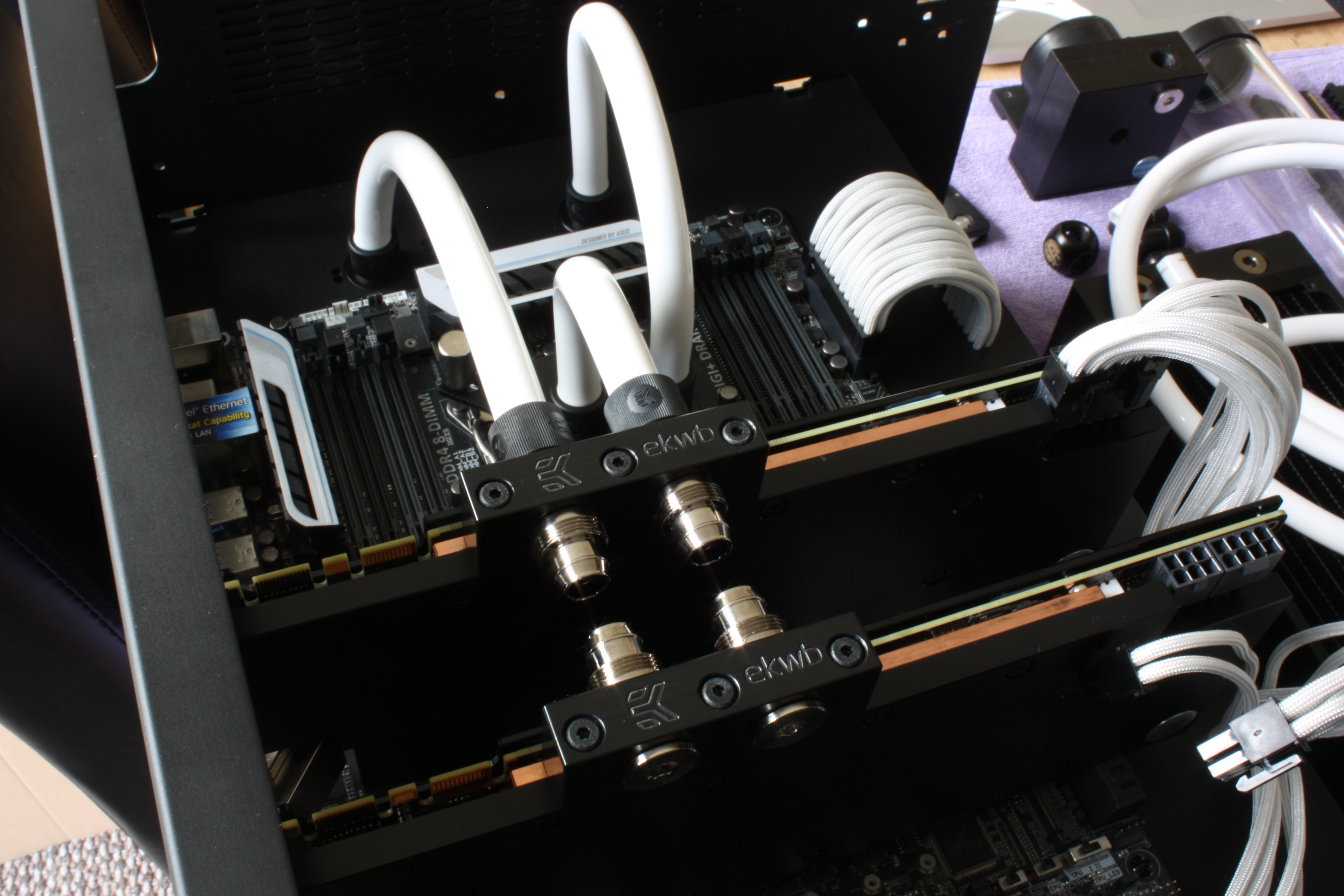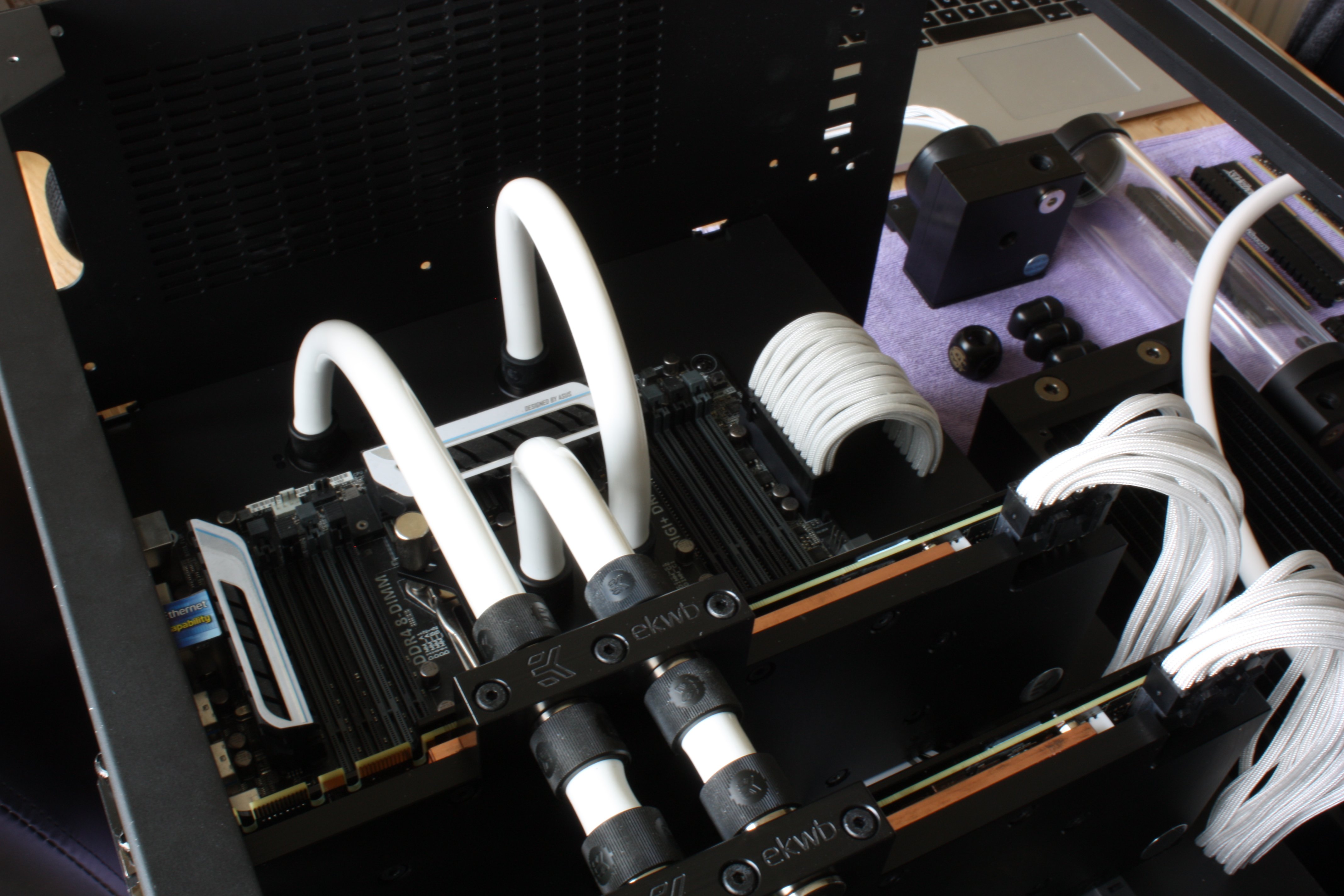 I then installed the GPUs into the machine and begun adding the water pipe for routing of the water to all of the components. The GPUs where plumed in parallel as the upstream components and then the output fed to the CPU. I knew ahead of time that this machine was mainly for deep learning experiments so cooling of the GPUs was the priority, hence having them be the first components in the loop, with cooling of the CPU being a secondary consideration. This probably doesn’t actually make any difference on the temperatures due to the flow rate but it seemed like the most logical setup to me.