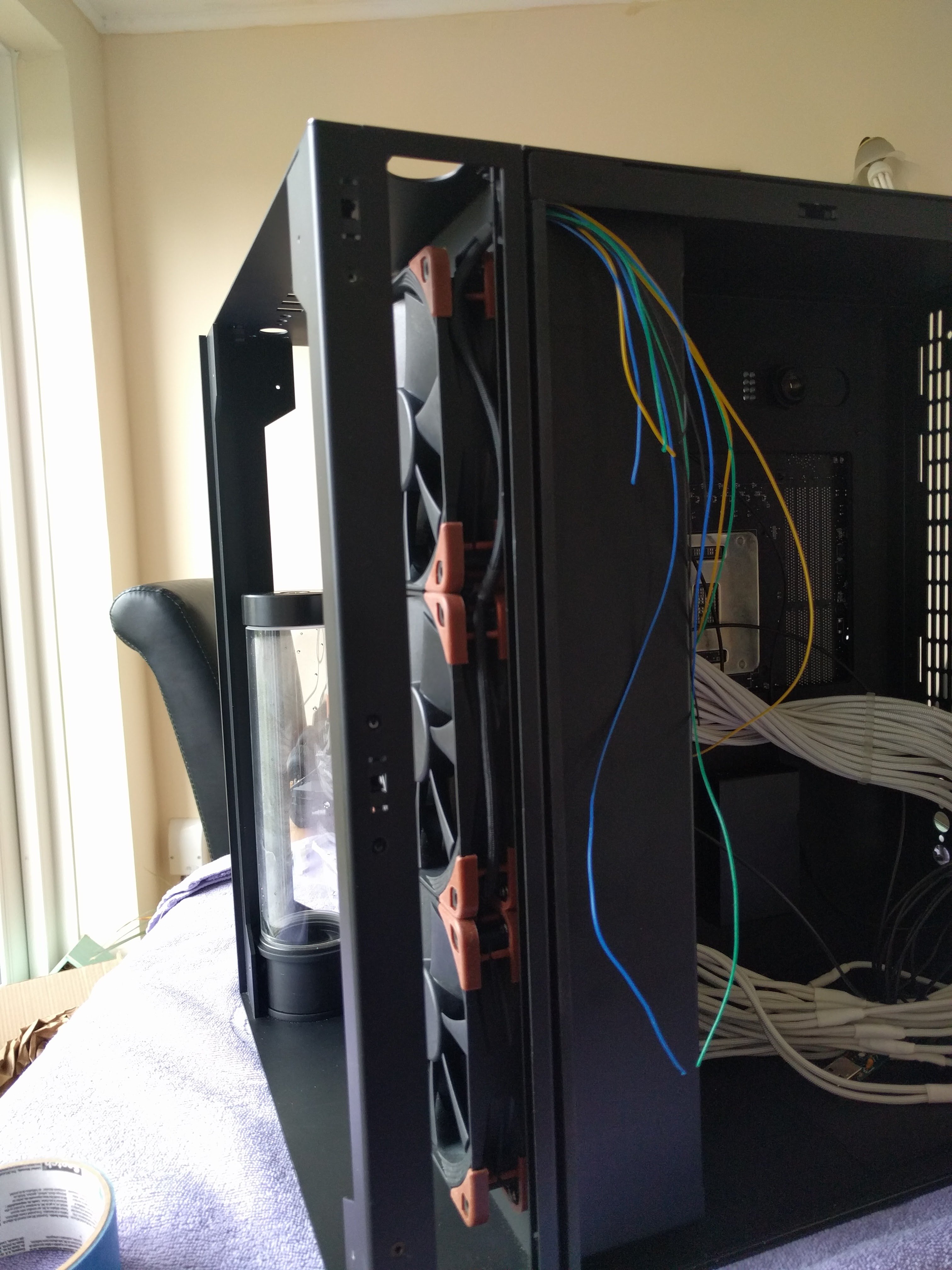 Unfortunately I didn’t get many pictures towards the end of this build, as I remember I believe that I had to start training some RL agents to play DOOM for a competition and couldn’t spend the time documenting with pictures the last part of the final assembly. However I will leave this last image of the fan splitter that terminates at the end of the custom length fan cables from the front of the case.