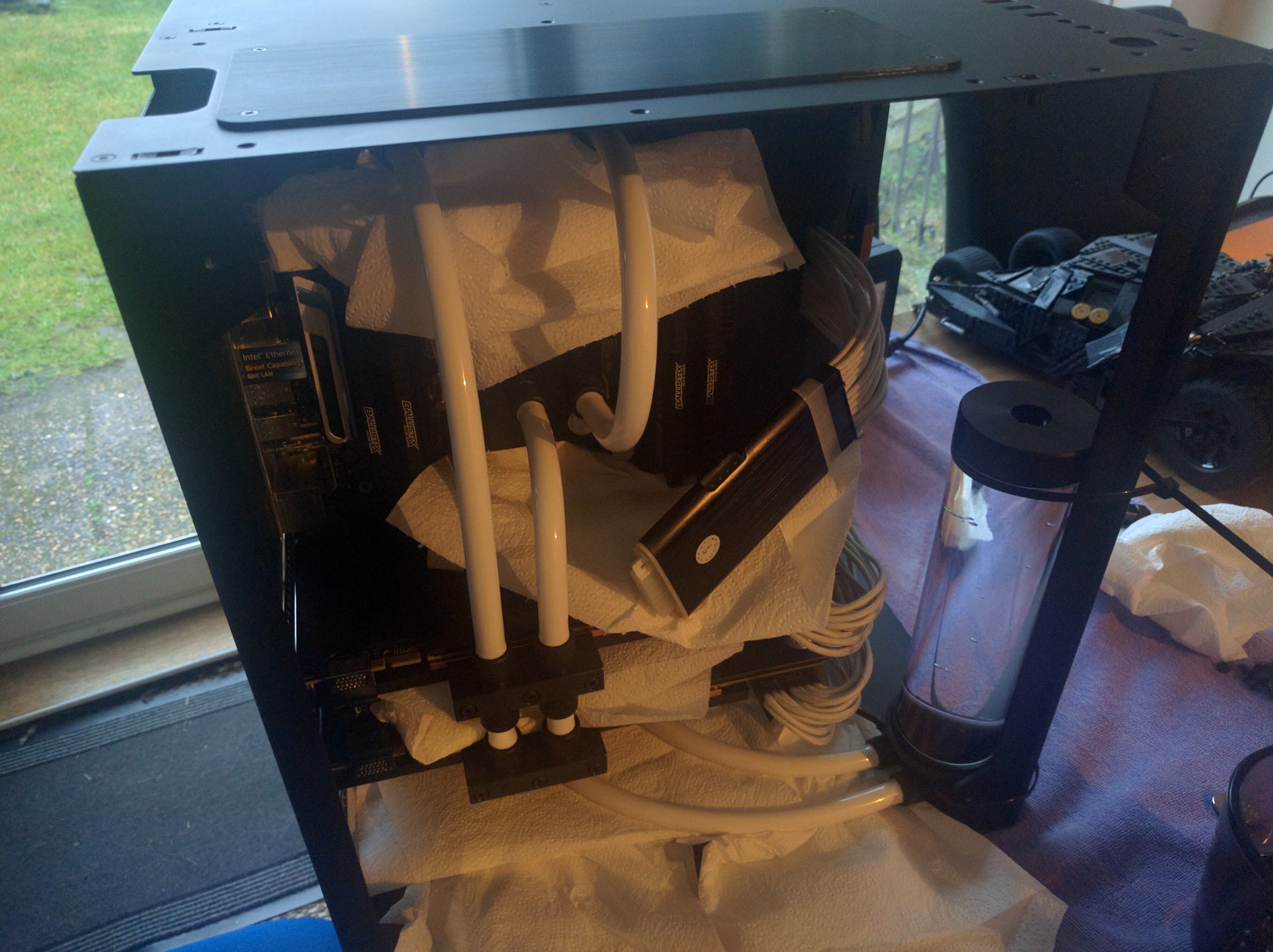 All of the components would then need to be plumed into the water loop in order to conduct the leak test. These components sans the CPU block are shown below.