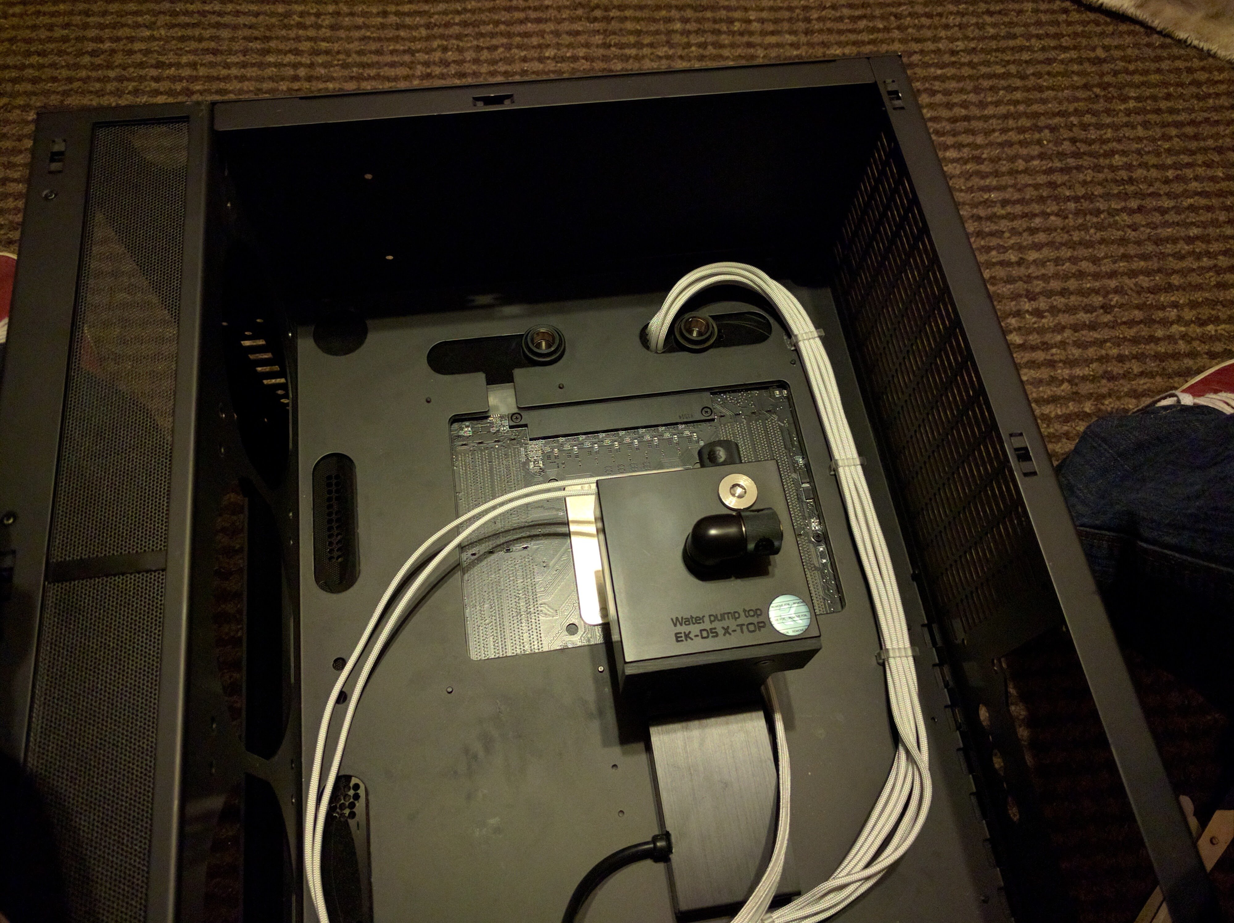 The first problem I wanted to tackle in the build was the water pump placement, as this was the most egregious problem of the CES build from Intel shown in Figure 2. There was lots to consider here with the pump needing to be mounted relatively low in the computer to make sure bleeding the water system was not too much of an issue. However in the rear compartment of the case the PSU sits at the bottom taking up all the room. With the reservoir I was using it was possible to mount the water pump just above the PSU, however there were no mounting locations so one would have to be made.