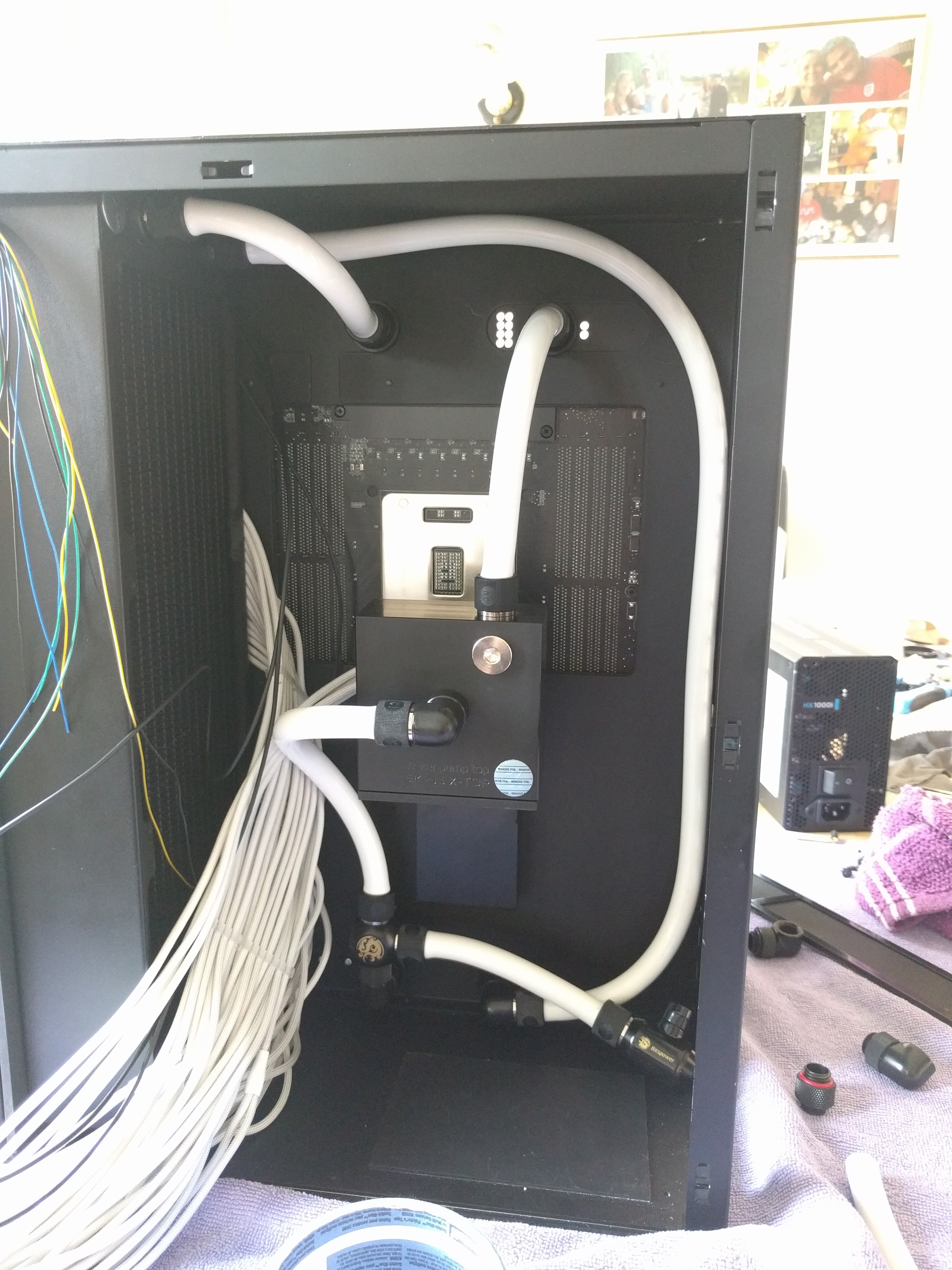 Once the rear was plumbed in I was able to conduct a water leak test by running the water pump without powering on any of the components in case their was a leak. I ended up having to only replace one faulty connector and then the water loop was completely done.