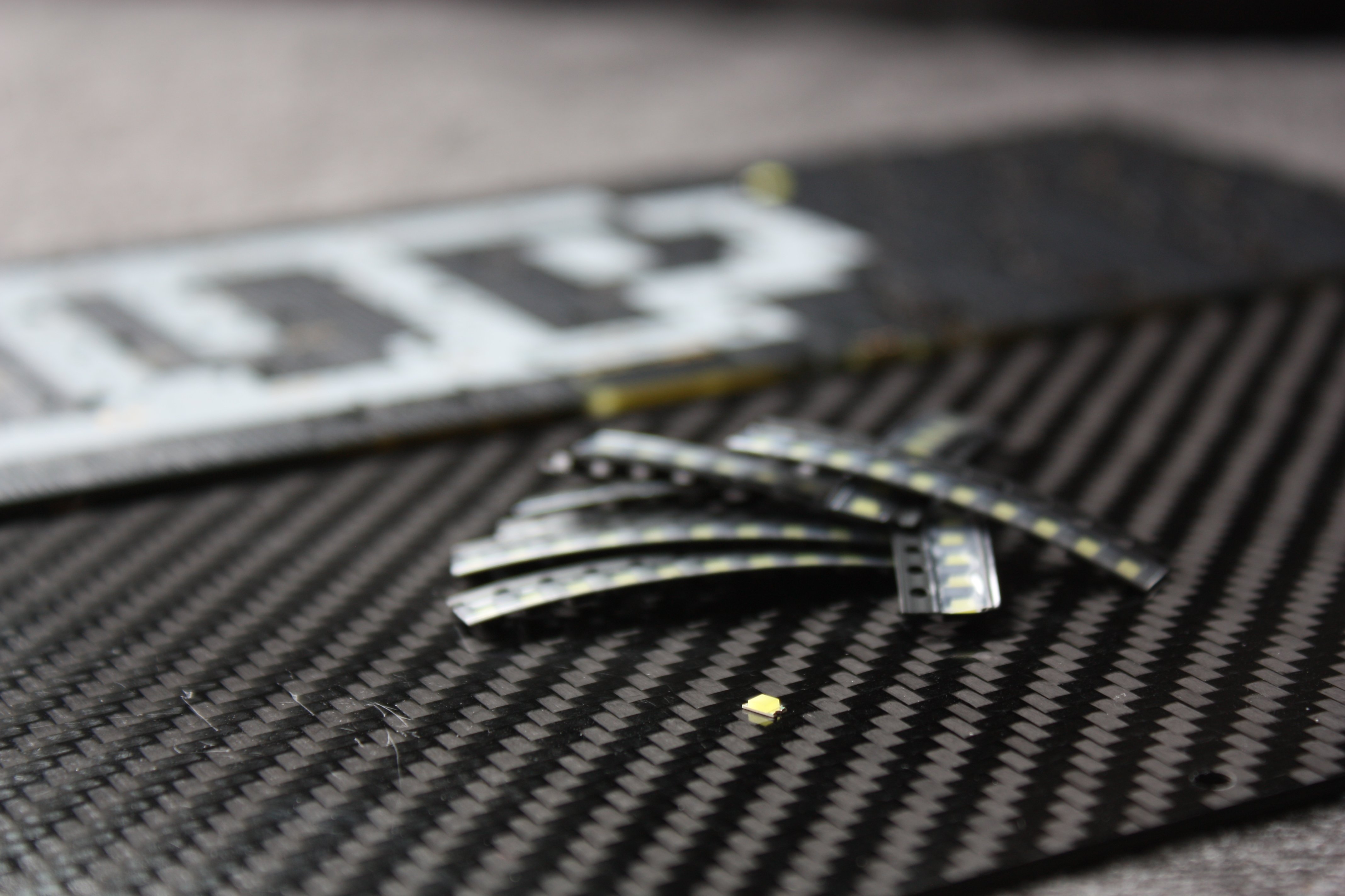 After mounting the LEDs it was just a case of soldering the key switches and bolting together the two carbon fibre plates. The final keyboard completed can be seen below.