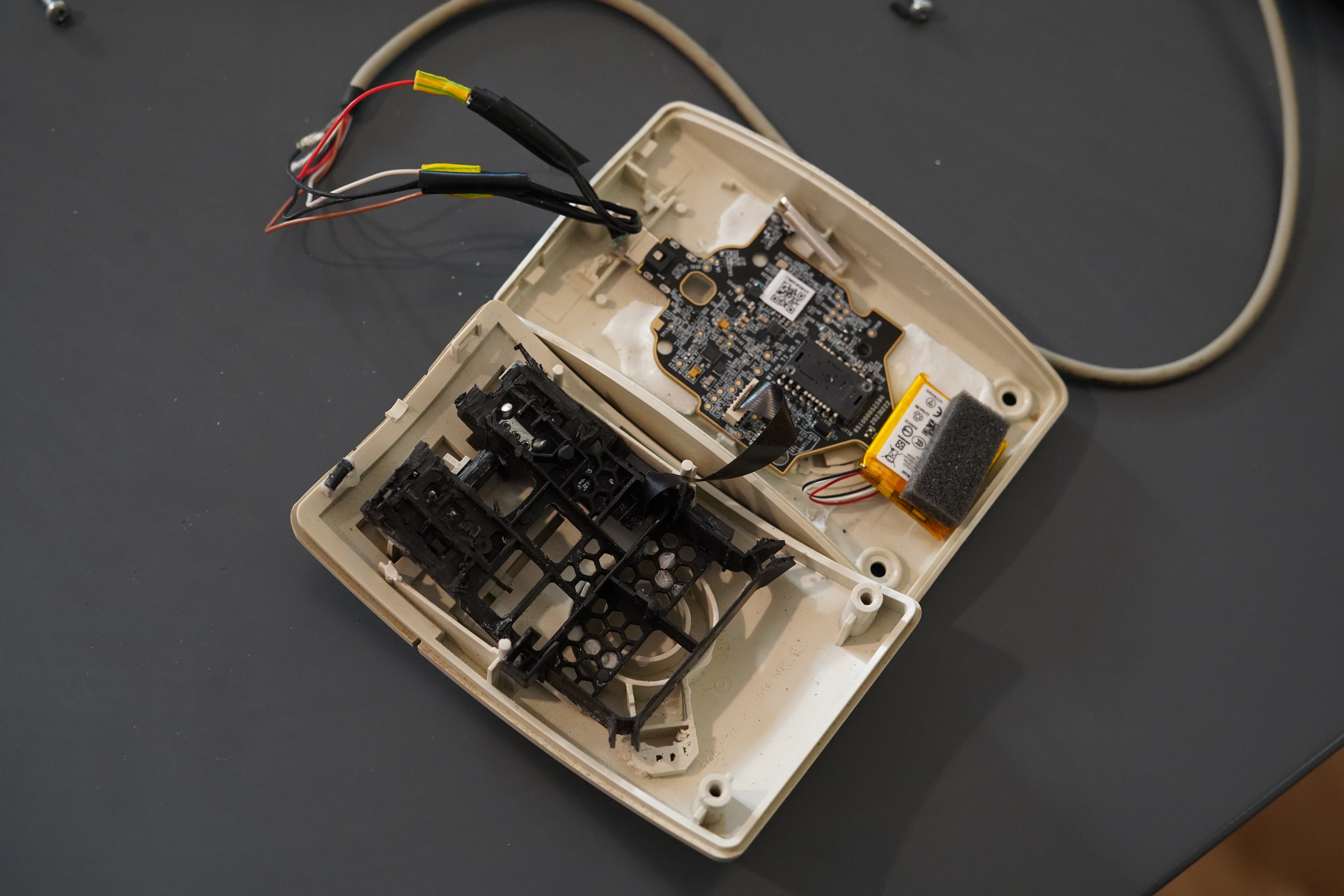 Here we just have a main board that contains the sensor, USB-C port and connector for a small lithium-ion battery and a daughter board that contains the left and right click switches the rotary encoder for the mouse wheel and another switch used for clicking down on the mouse wheel. The fact that the daughter board is mounted to a plastic frame is rather convenient as it allows me to modify it to fit the new mouse and brace itself against the bottom of the mouse.