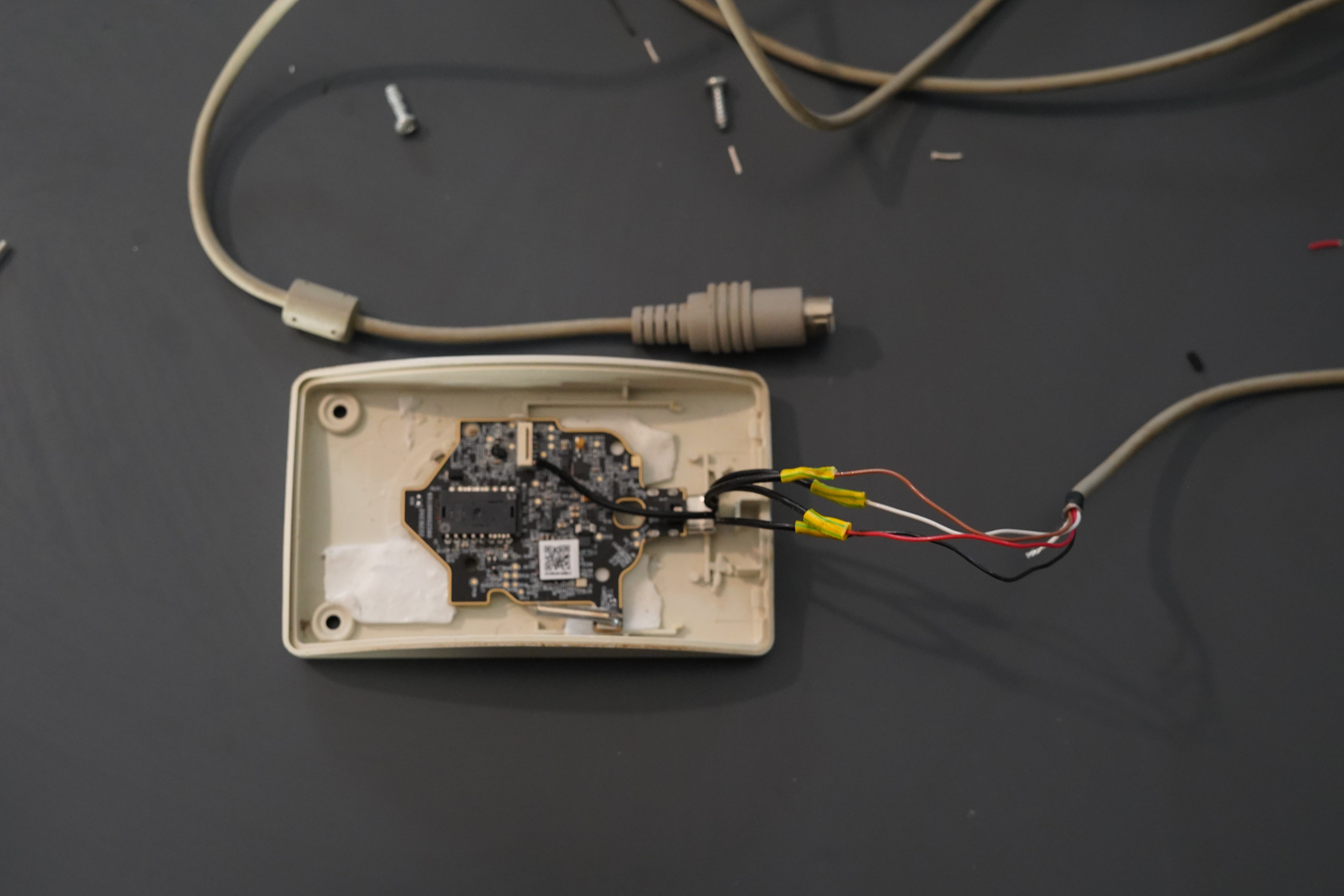 I now needed to mount the sensor in the bottom of the mouse. This was pretty simple compared to the buttons, all I needed to do was remove the plastic needed for the ball mouse and then mount the PCB in the right place that the sensor will line up with the hole left by the ball. The more complicated step of this process was to solder the PS/2 cable to the USB-C connector so that it could be used with the new mouse internals, leaving the external appearance of the mouse identical to before the retrofit.
