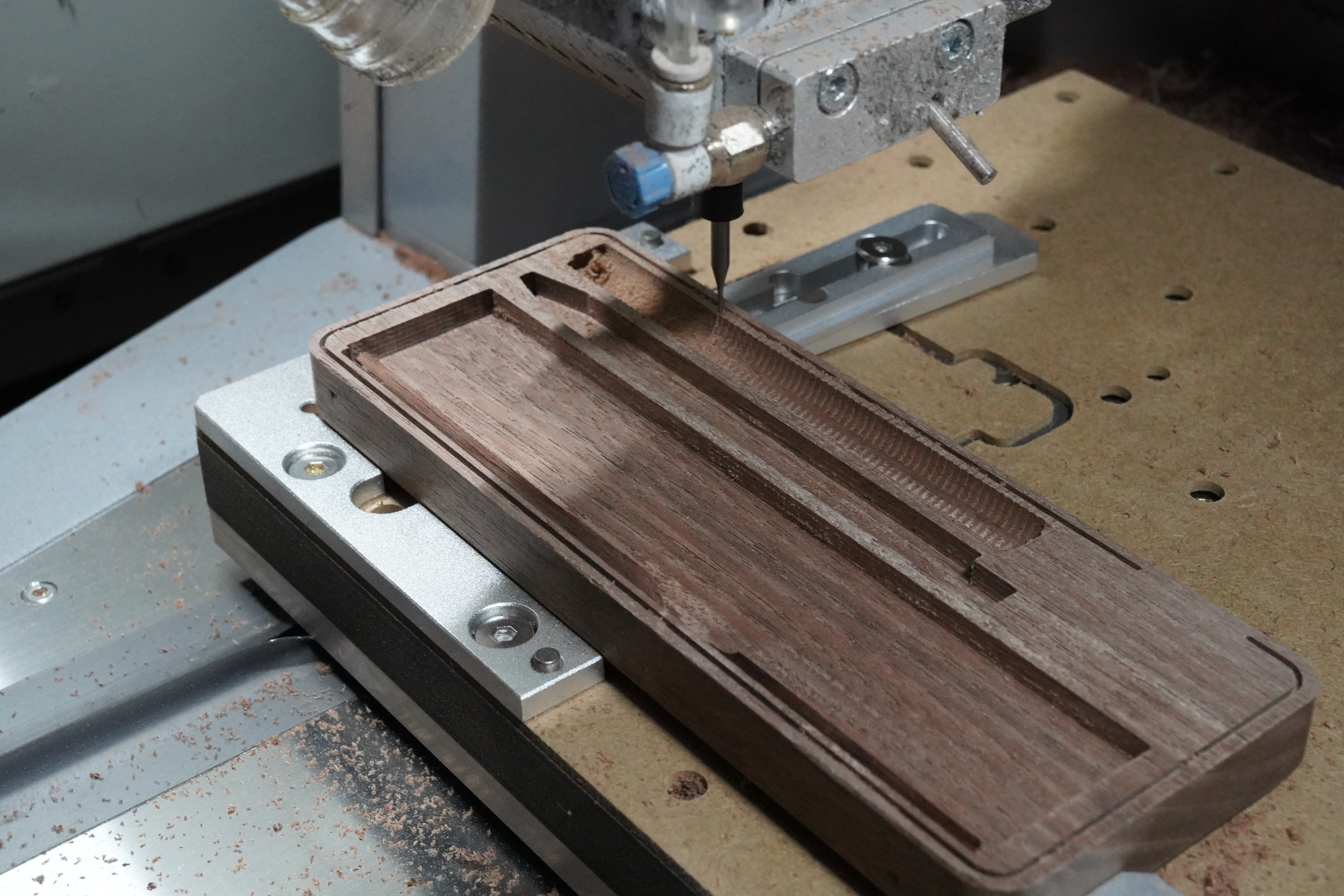 In Figure 3 I show an example of milling the internal geometry of one of the halves, showing clearly how the pockets are milled to fit the items perfectly, it was important to use ball nose bits for the pencil pocket in order to get a good finish surfact that needed little sanding.