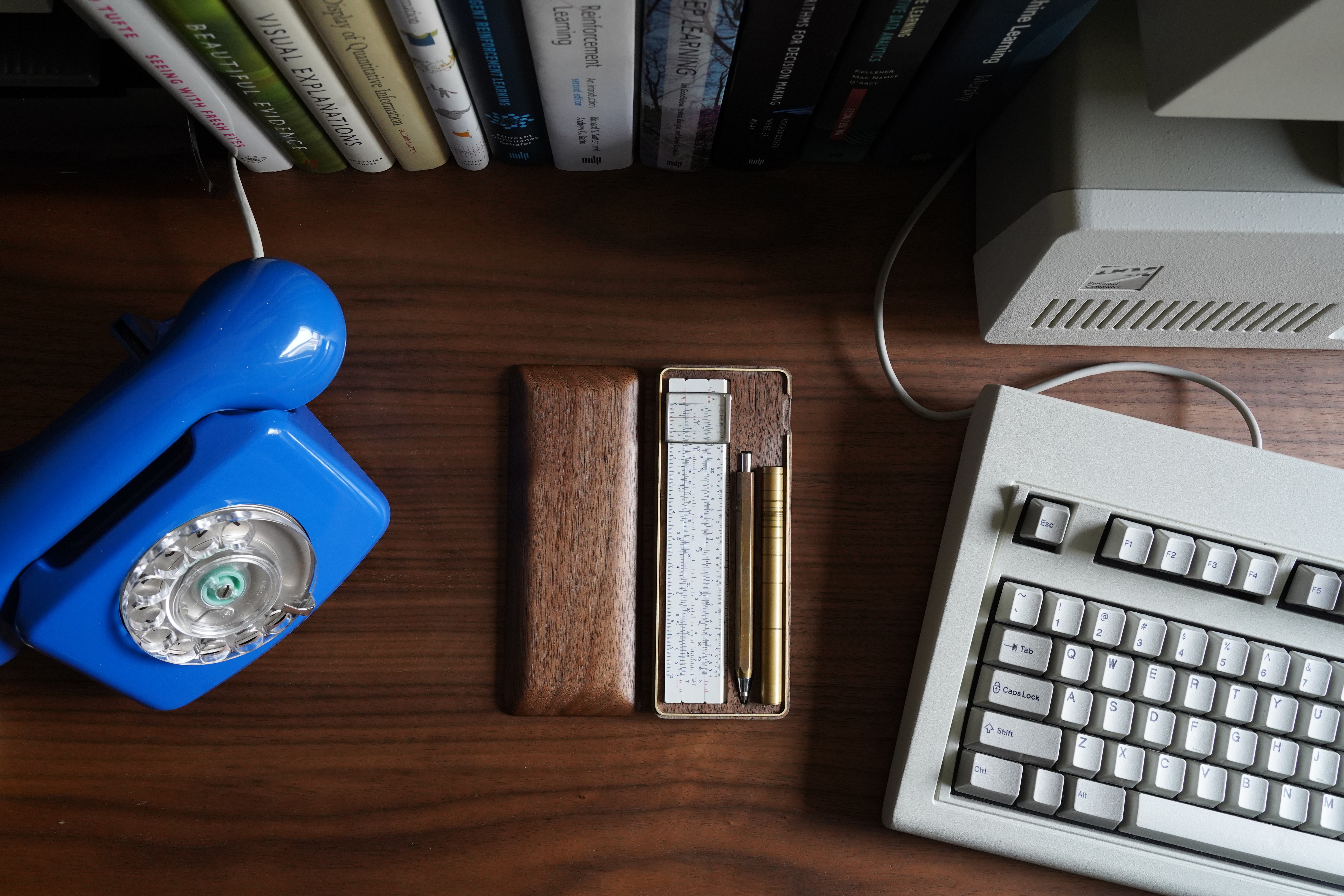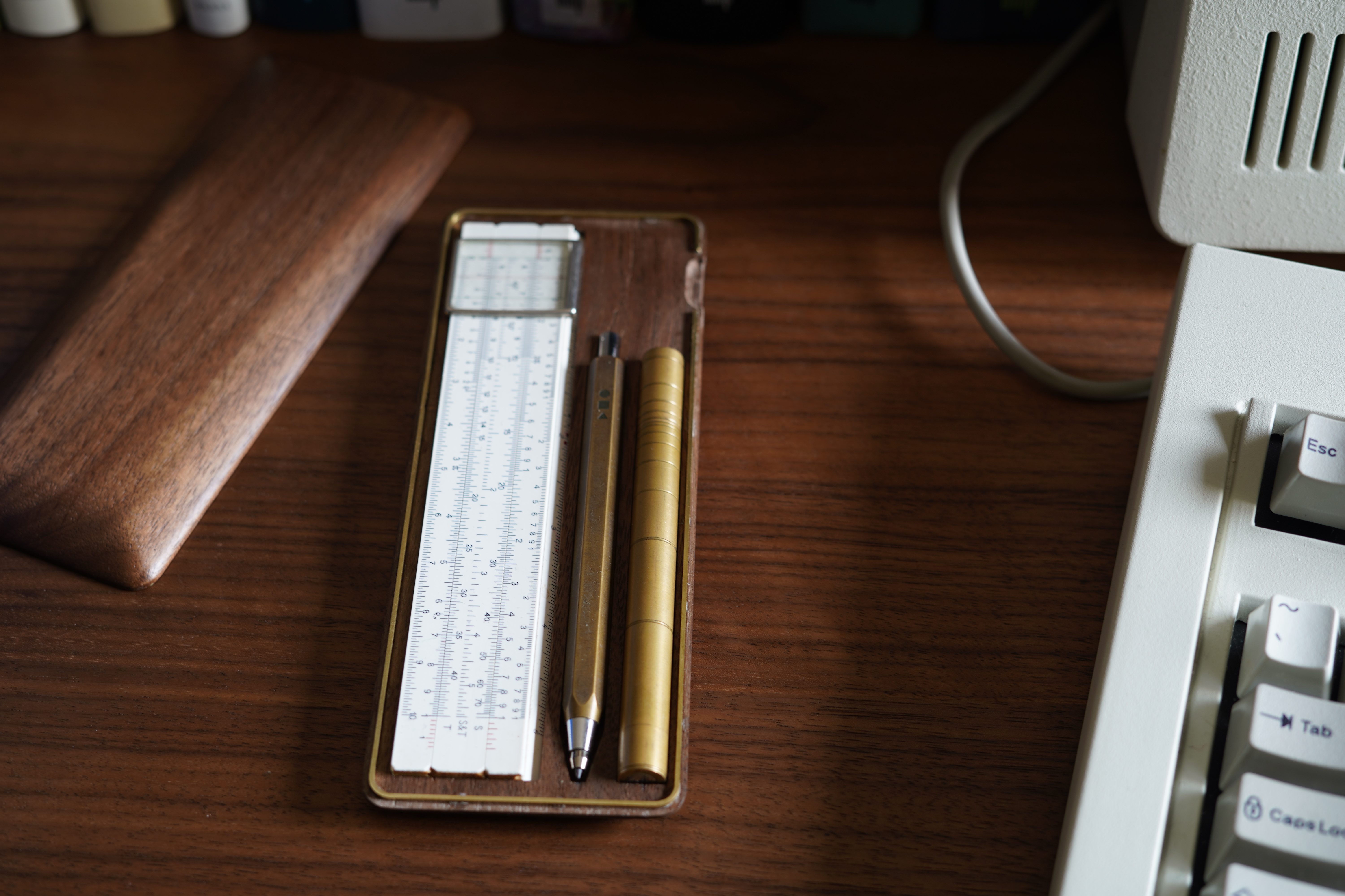 As part of this I have collected a minimal set of items that I like to carry with me alongside a notebook in order to effectively take notes. These mainly consists of a brass pen and pencil from Rick Powell Design, and a slide rule. The pen did come this a walnut tube to store it in, however I wanted something that could hold all the items I carry daily.